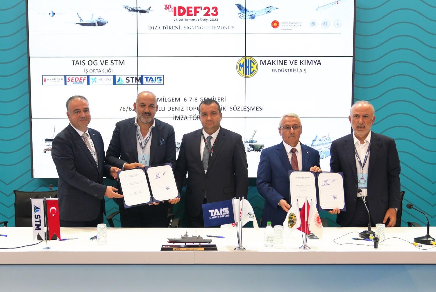 STM, which continues its activities under the leadership of the Presidency of the Republic of Türkiye Presidency of Defence Industry Agency (SSB), held six different cooperation ceremonies during the IDEF exhibition. Contracts were signed between STM-TAİS and ASELSAN, HAVELSAN and the Makine ve Kimya Endüstrisi A.Ş. (MKE) for equipping the 6th, 7th and 8th ships of the MİLGEM İstif Class, which will be built by the STM-TAİS Joint Venture, with national combat systems. Agreements were signed with İşbir Elektrik Sanayi A.Ş. for the supply of diesel generator sets and Türk Loydu for classification services.