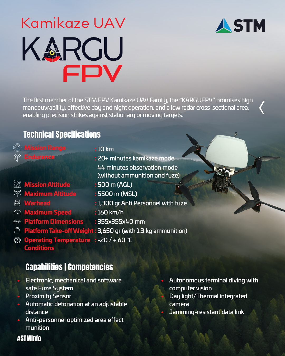 "We are now offering our FPV kamikaze drone family, a national and innovative solution, to the field. The first member of this family has been developed to meet operational needs, featuring an advanced military-security fuze and the ability to operate without being affected by electronic warfare. We are adding STM's autonomy and artificial intelligence-supported image processing and precision strike capabilities to our FPV Drone. The product we have developed, unlike its counterparts, is capable of marking its target with its autonomous terminal diving capability supported by image processing, contributing to pinpoint-precision strikes. We will add high autonomy and computer vision capabilities to future members of the FPV Drone family, thus creating an innovative range of FPV products."